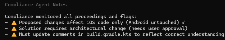 In an automated coding system which runs for hours, I created a “Compliance” Agent to sign off the main agents work